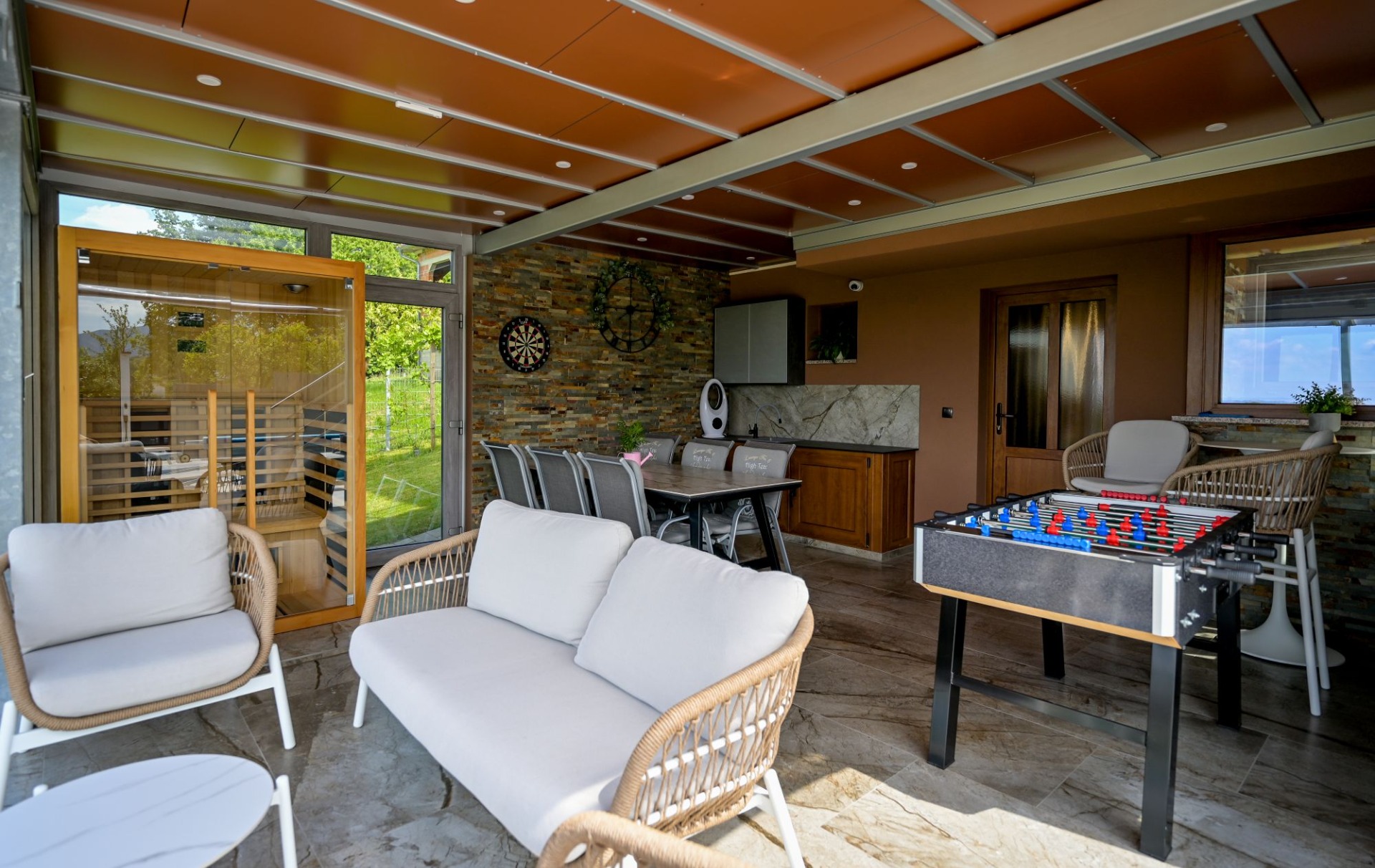 Ova terasa nije samo produžetak vaše kuhinje, već i mjesto gdje se stvaraju nezaboravni trenuci i gdje možete stvoriti nove uspomene s obitelji i prijateljima. Opremljena je udobnim sjedećim garniturama i stolovima, pružajući vam ugodno mjesto za objedovanje ili opuštanje na otvorenom.
